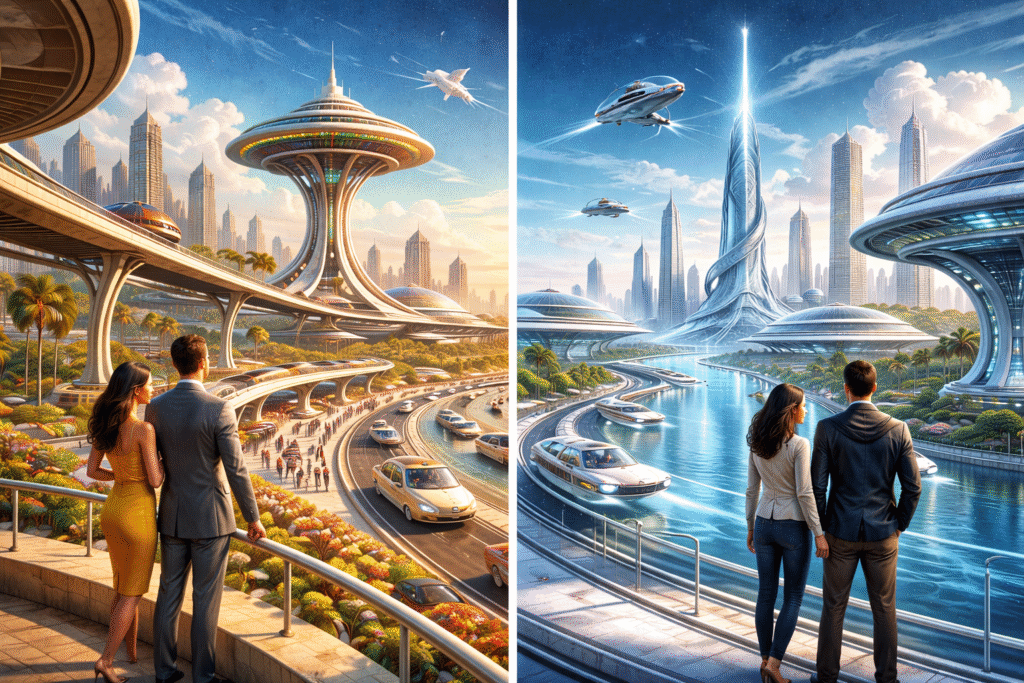 Retro futurism and modern futurism differ in both style and philosophy. Retro futurism focuses on mechanical, colorful, and highly detailed environments. Modern futurism prefers clean, minimal, and digital designs. While retro futurism aesthetic uses visible machines and analog controls, modern futurism emphasizes invisible technology and smart systems. Both styles reflect different cultural expectations of the future, making them equally important in understanding design evolution.